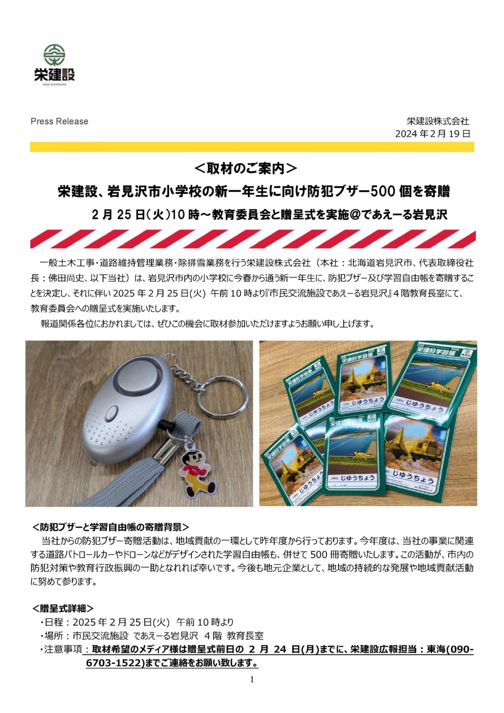 岩見沢市小学校新一年生に防犯ブザー500個寄贈(プレスリリース)