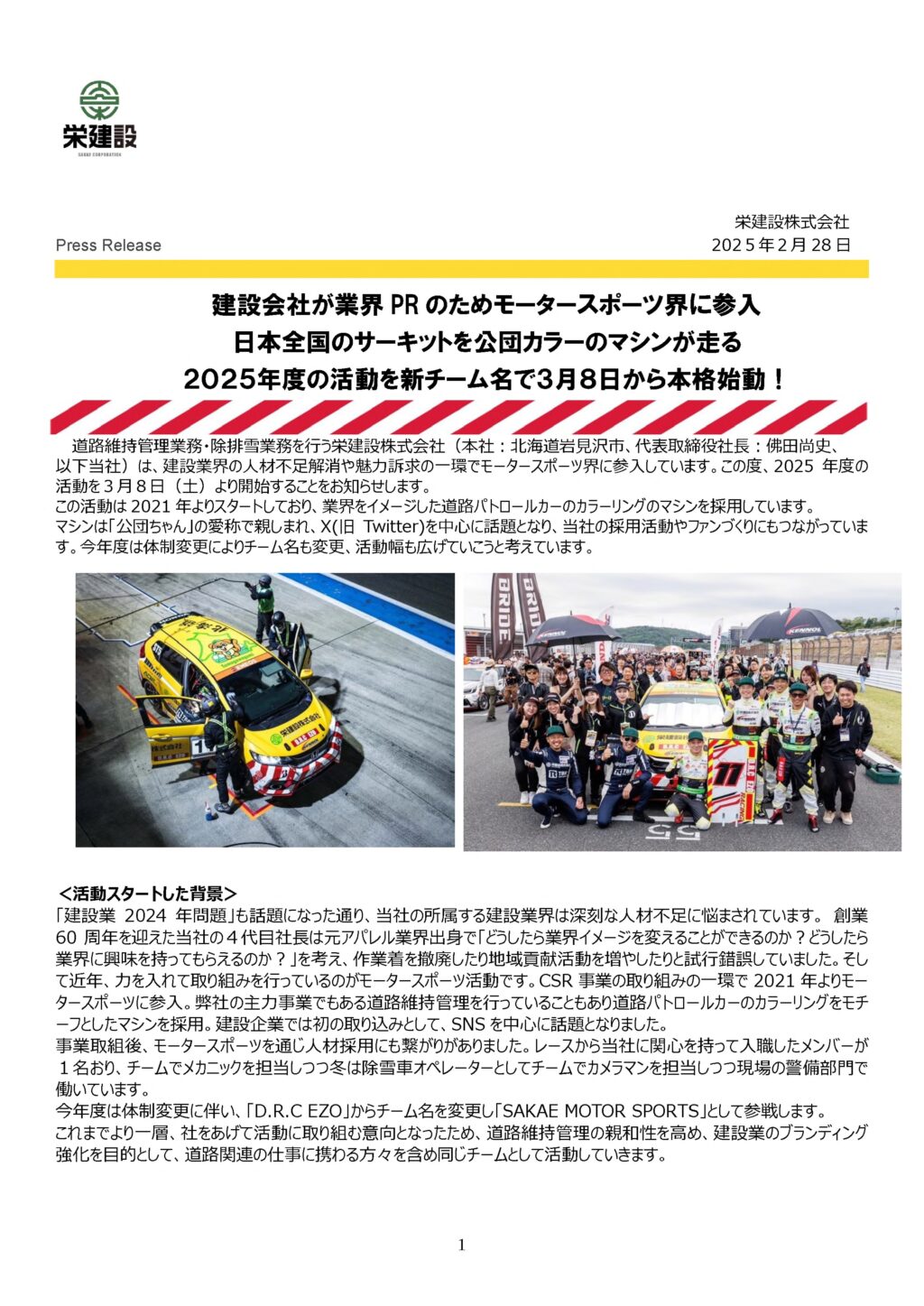 建設会社が業界PRのためモータースポーツ界に参入(プレスリリース)