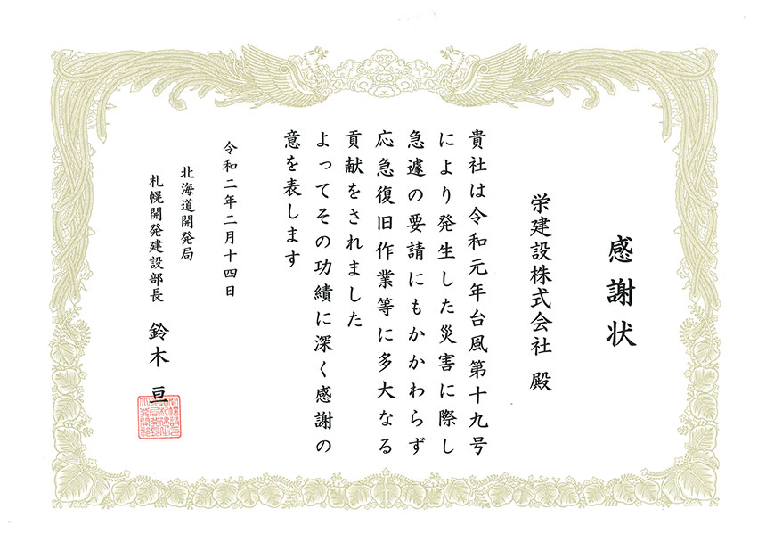 令和2年 開発局 台風復旧感謝状