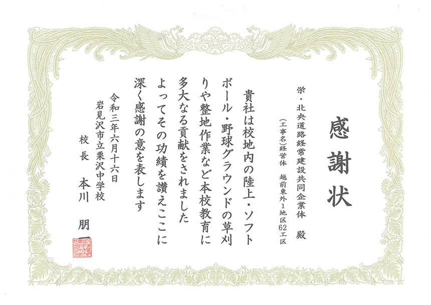 令和3年 栗沢中 感謝状