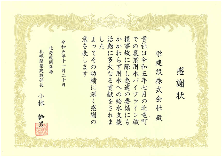 令和5年 開発局 パイプライン復旧感謝状
