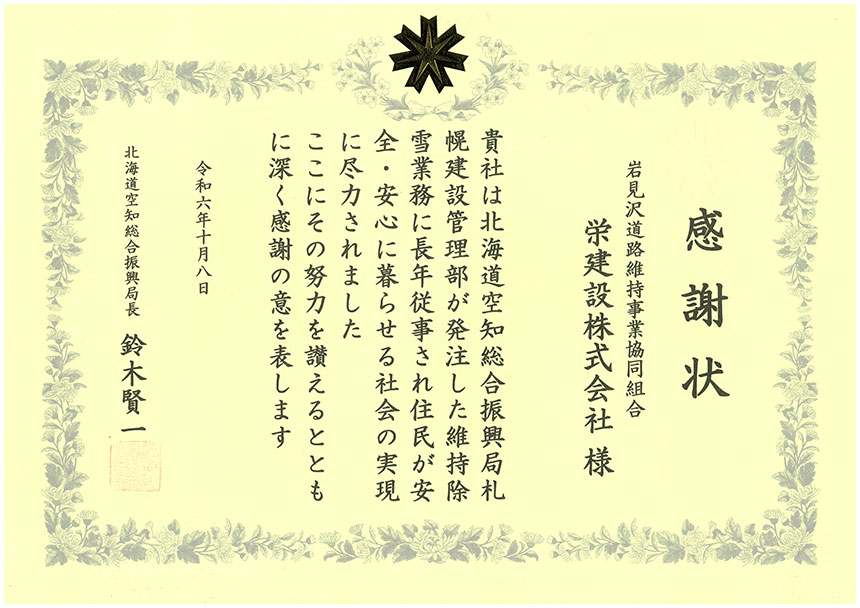 令和6年 空知総合振興局 除雪感謝状