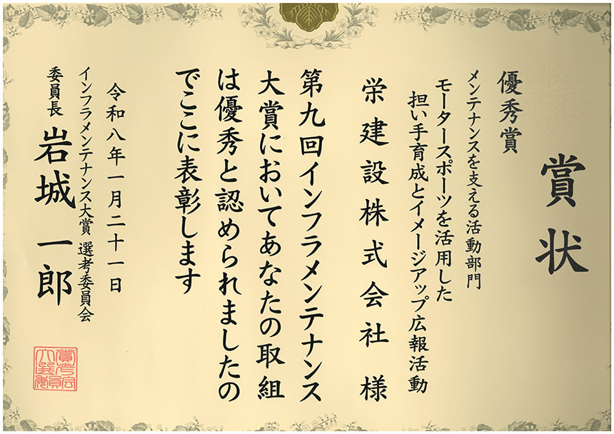 令和8年 インフラメンテ 賞状