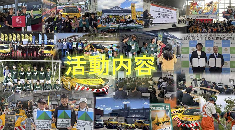 建設業にPRを!テーマに『公団ちゃん』を活用した広報活動は、レース活動にとどまらず、地域イベントおよび産学連携活動、社会貢献の場へと広げ、多数のメディアに取り上げられるなど、地域社会から注目を集めています。