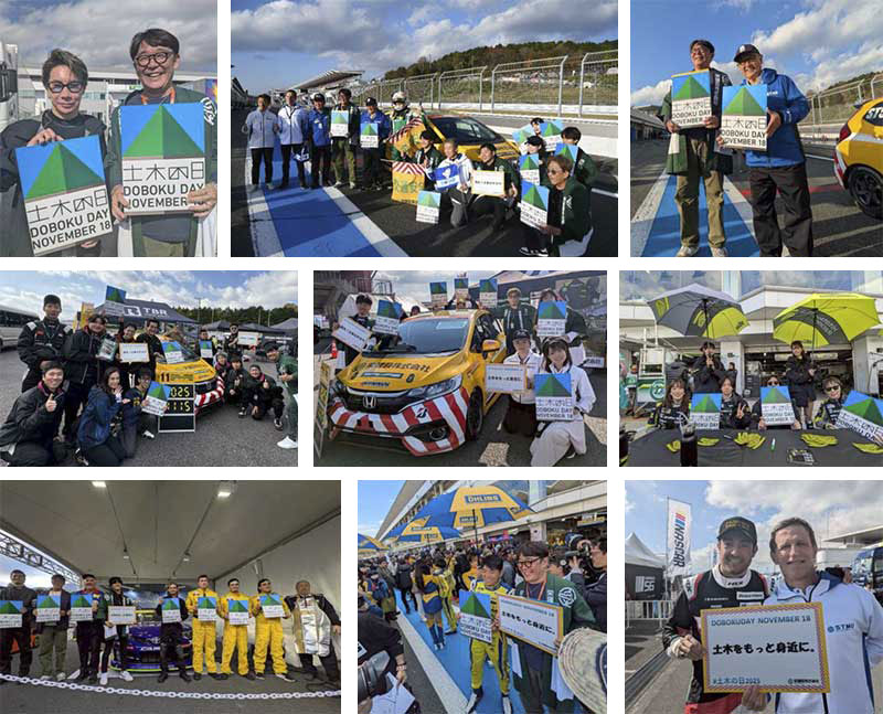 11月18日の『土木の日』に向け、サーキットで広報活動を実施しました。近年、建設業界では土木の魅力を社会へ発信する取り組みがSNSを中心に活発化しています。弊社も日常を支えるパートナーである“車と土木”の密接な関係に焦点を当てた情報発信を強化し、レース関係者の皆さまにご協力いただきました。「車と土木がつなぐ未来」の可能性を改めて実感するとともに、サーキットで交わされた温かな交流やいただいた応援の声を今後の活動の糧として、今後も土木の魅力発信に努めてまいります。