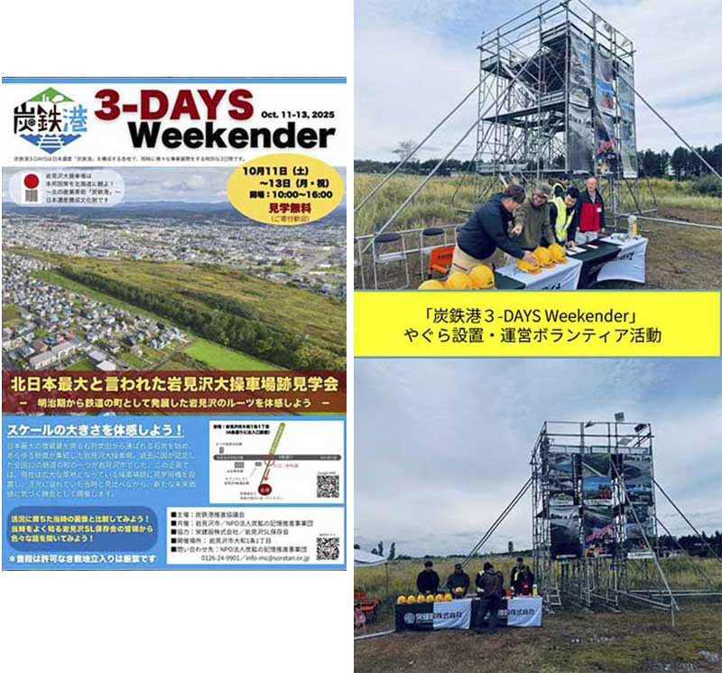 2025年10月に開催された 「炭鉄港 3-DAYS Weekender」に併せて実施された 「岩見沢大操車場跡見学会」において、弊社はやぐらの設置や当日の交通誘導を担いました。 普段は立ち入ることのできない岩見沢大操車場を公開するこの見学会は、 地域が歩んできた産業と文化の歴史を再発見できる貴重な機会です。